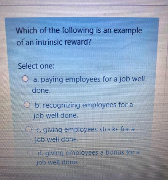 Which of the following is an example of an intrinsic reward. Extrinsically motivated people will keep doing the same task even if it is not rewarding. If your employees are tasked with completing complex tasks simply doing those tasks over and over again until they feel comfortable and confident in their abilities offers intrinsic reward opportunities.